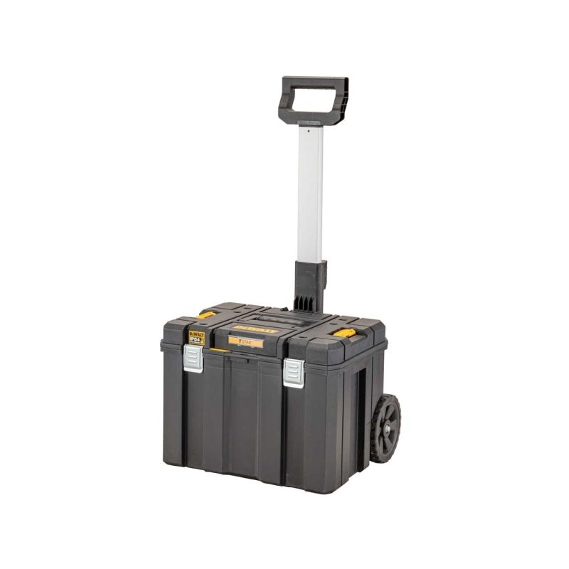 The DEWALT TSTAK™ Mobile Storage is a large volume unit for storing larger hand tools and power tools. The toolbox has strong, tough metal latches and metal hinges for heavy-duty use. With a strong telescopic handle that is made from plastic and metal for increased durability and durable 7in wheels for manoeuvrability.